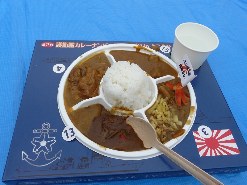 自分は3番はたかぜ、4番はるさめ、13番ときわ、15番あたごのカレーを食べました。本当はもう4種類行きたかったのですが2皿用トレーが売り切れという…焦がし豚&チーズが美味しかったはたかぜに投票しました。